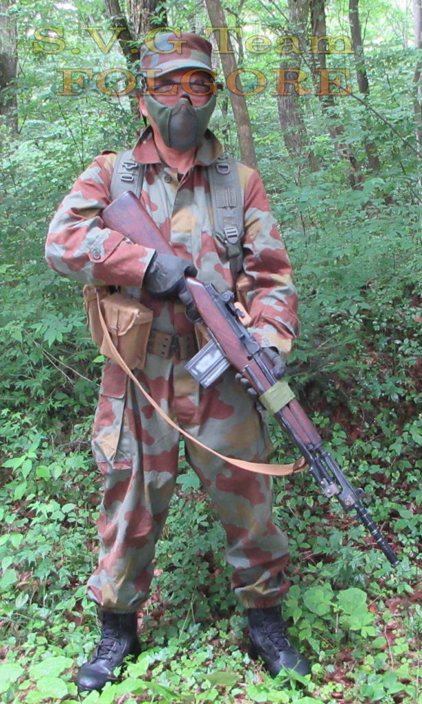 1980年代のムック本世界の軍隊の中でこのツナギを着て強襲揚陸艦の艦上に整列するサンマルコ海兵隊の写真があります。 ODの略帽、ライフルリザーバ、アメリカ型の金属バックル弾帯の足元にBM59ライフルが置かれています。 迷彩パターンは第2次大戦型に近いのですが下の2ピース型も同様に70パラ迷彩に近いウッドランド色調の物もあり同じ様に前期型迷彩色調の2ピースモデルもあります。 WW2のドイツSSの改造素材としても良く使われています。 陸軍の60パラや70パラモデルに比べ厚手の丈夫な生地で作られれています。 |