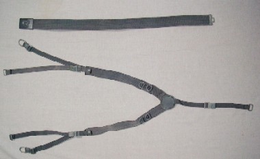H型サスペンダーはイギリスのP58装備と同じ取り付け方法でベルトに取り付けます。前面には2個の包帯用ポケットがあります。 ベルトもイギリス軍型で取り付け方法、バックルの形状も酷似しています。薄い緑色の化繊製です。 |