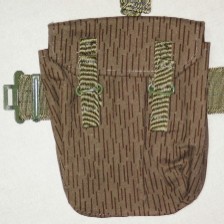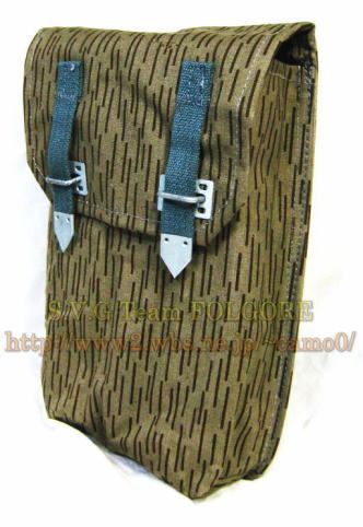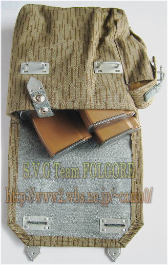 AK(Mpi)用マガジンポーチより5cmほど長くRPK用45連マガジンに対応しています。 構造はAK(Mpi)用よりシンプルでAK(Mpi)用に見られる側面の油差し入れと内側1ケ所にあった固定用ストラップはなくAK(Mpi)用同様4本の45連マガジンが収納出来ます。 近年(2010年)頃になり現れた出所が気になるマガジンポーチです。 |