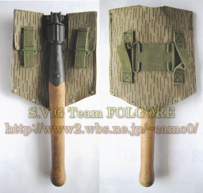 東ドイツの携帯シャベルは第2次大戦型の物が使用されており。角スコップ型と折畳式の2種類があります。共に第2次大戦当時の物に類似した革製のシャベルカバーでベルトに取り付けますが折畳式はレインドロップ迷彩のシャベルカバーもあります。 | |