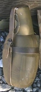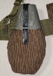 第2次大戦時と同じデザインの水筒ですが中身は大違いです。 上部にアルミカップが付きます。 本体はポリエチレンの様な軟質素材でペットボトルとも違います。これに迷彩カバーをかけた物です。革ベルトもビニールの様な素材で総じておもちゃの様な水筒です。 値段も有名店で700円程なので値段成りという感じです。 |